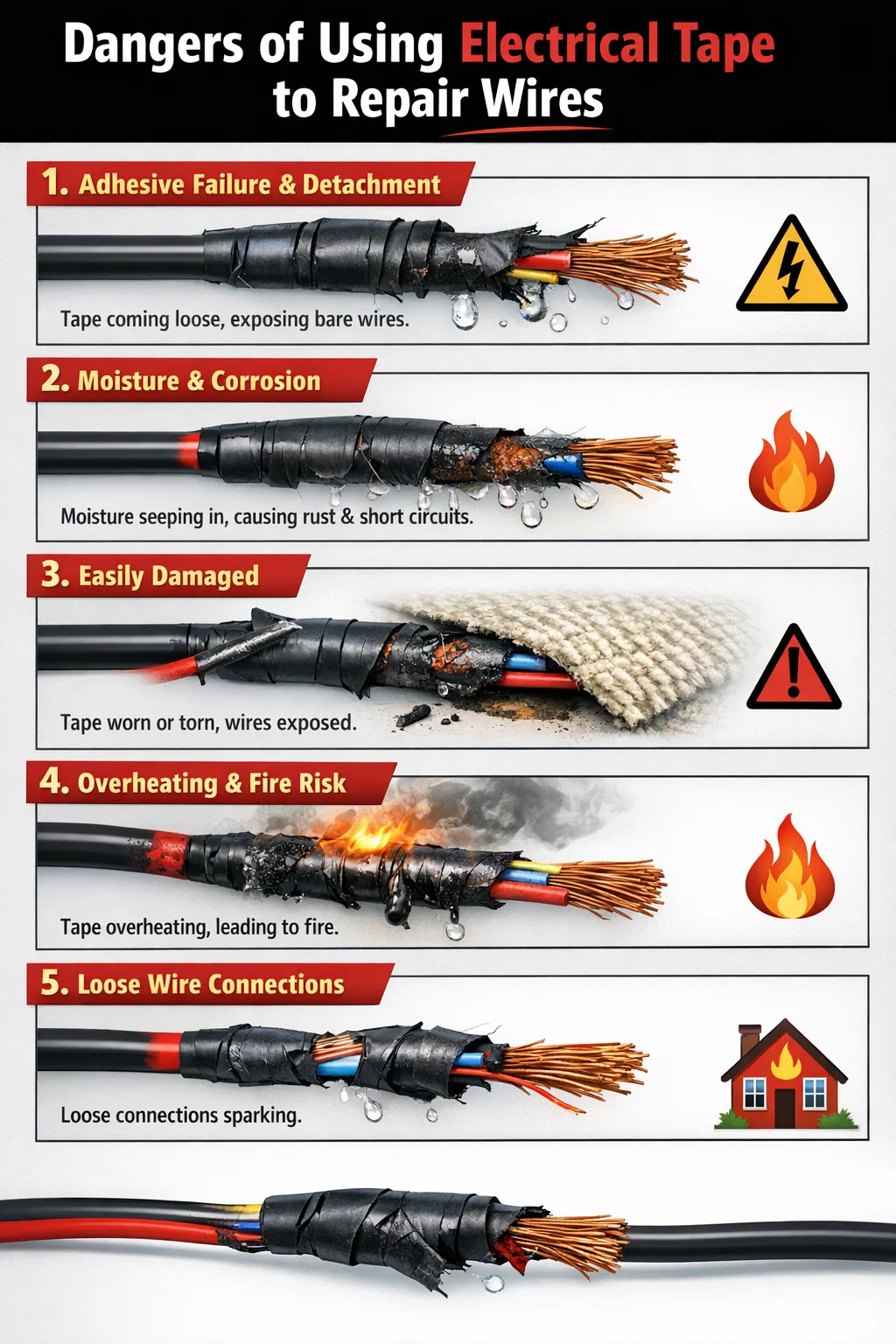 Here are some common risks associated with using electrical tape to repair wires: